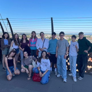 Aufgeregt und voller Vorfreude machte sich die 7. Stufe heute auf den Weg nach Straßburg. In den nächsten Tagen werden wir die Europäischen Institutionen besuchen und „Europas Hauptstadt" erkunden. Trotz fünfmaligem Umsteigen haben wir die Fahrt gut gemeistert und konnten vor der zweiten Etappe sogar ein kurzes Picknick im Basler Rosenfeldpark genießen. In Straßburg angekommen, haben wir uns nicht allzu lange im Hotel verweilt, denn wir wollten ja noch vom Turm des Münsters aus einen Blick auf die Stadt werfen. Und weil es bei Erasmus+-Projekten auch darum geht, uns mit Menschen aus anderen Ländern auszutauschen, haben wir kurz darauf Schülerinnen und Schüler sowie zwei Lehrerinnen aus unseren Partnerschulen in Aschheim bei München sowie Balzers in Liechtenstein getroffen. Bei typischen Elsässer Flammkuchen – würzig und auch süß – haben wir erste Kontakte geknüpft. Wir freuen uns darauf, sie morgen besser kennenzulernen.
