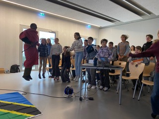 Sie waren aus Tansania gekommen, weil dort das Geld hinkommt. Ihre Rituale sind ihnen wirklich wichtig, deswegen zeigten sie sie uns. Ein paar Worte brachten sie uns auch bei, zum Beispiel „Nambo boa", das bedeutet so viel wie „Wie geht's? - Cool!” Und man muss, wenn man „Boa" sagt, einen Daumen hoch geben. Das ist ganz wichtig. Auch tanzten sie mit uns.