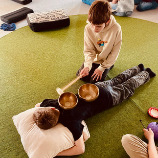 Besonders spannend war es, die Klangschalen gegenseitig aufzulegen und die feinen Vibrationen am eigenen Körper zu spüren. Auch eine sanfte Massage mit der Klangkugel sowie das Lauschen der tiefen, beeindruckenden Klänge des Gongs sorgten für viele ruhige und achtsame Momente.